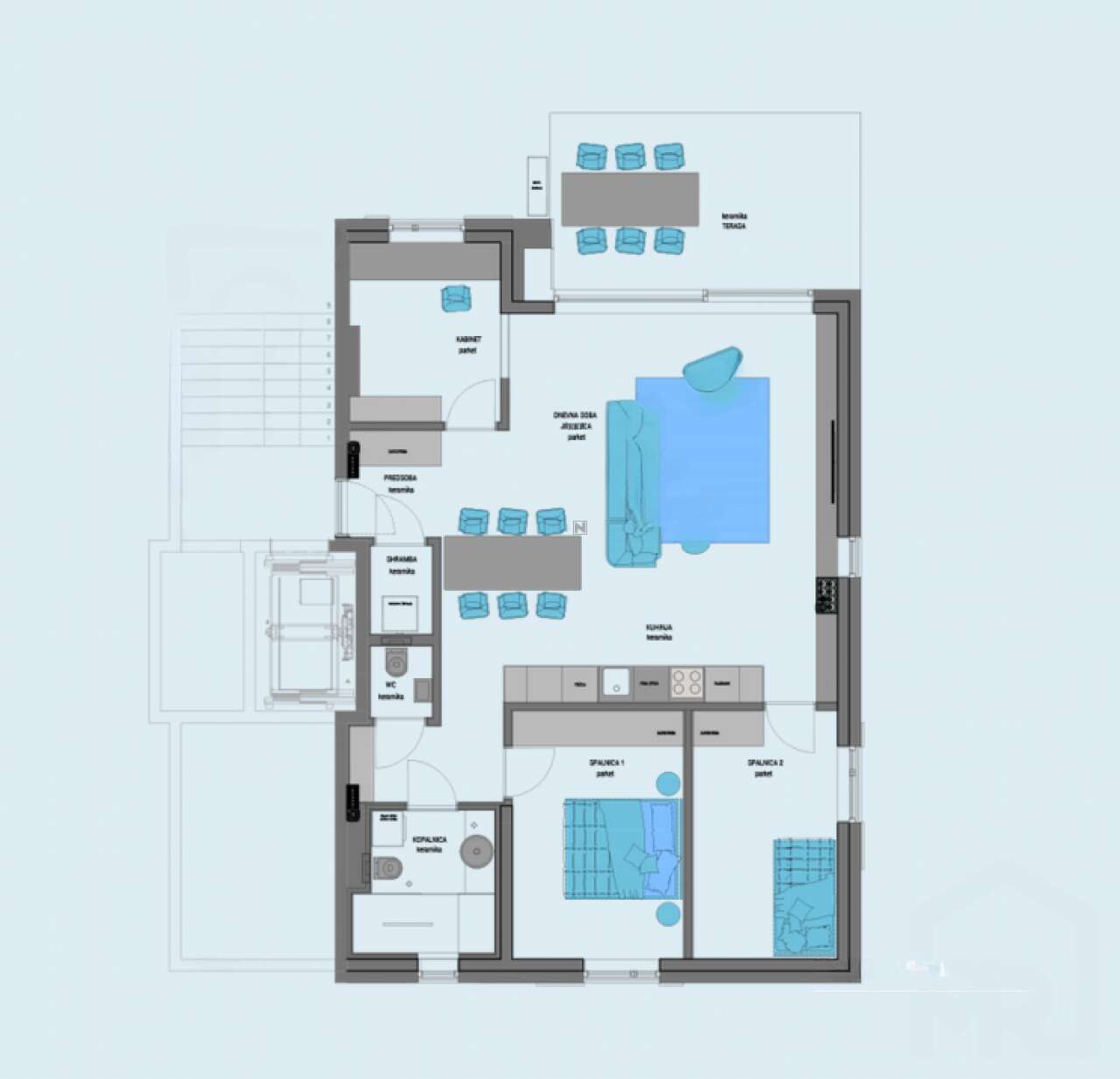 Здесь есть три спальни, просторная гостиная площадью 38,2 м², кухня и ванная комната. Атриум площадью 119 м² и терраса 30 м² выходят на восток, позволяя наслаждаться утренними солнечными лучами. Полы с подогревом и система отопления на базе теплового насоса, вместе с кондиционером, обеспечивают комфортный микроклимат в квартире.