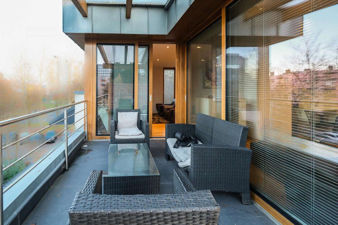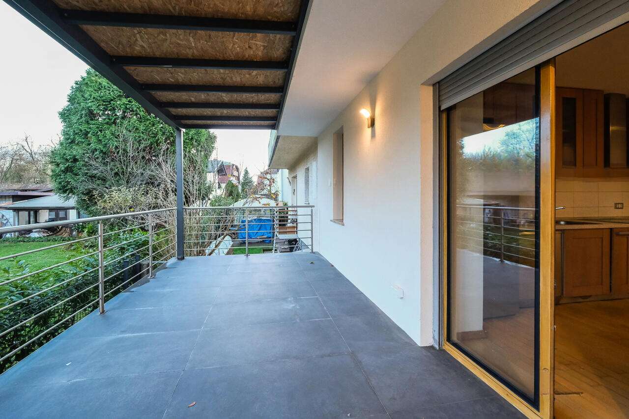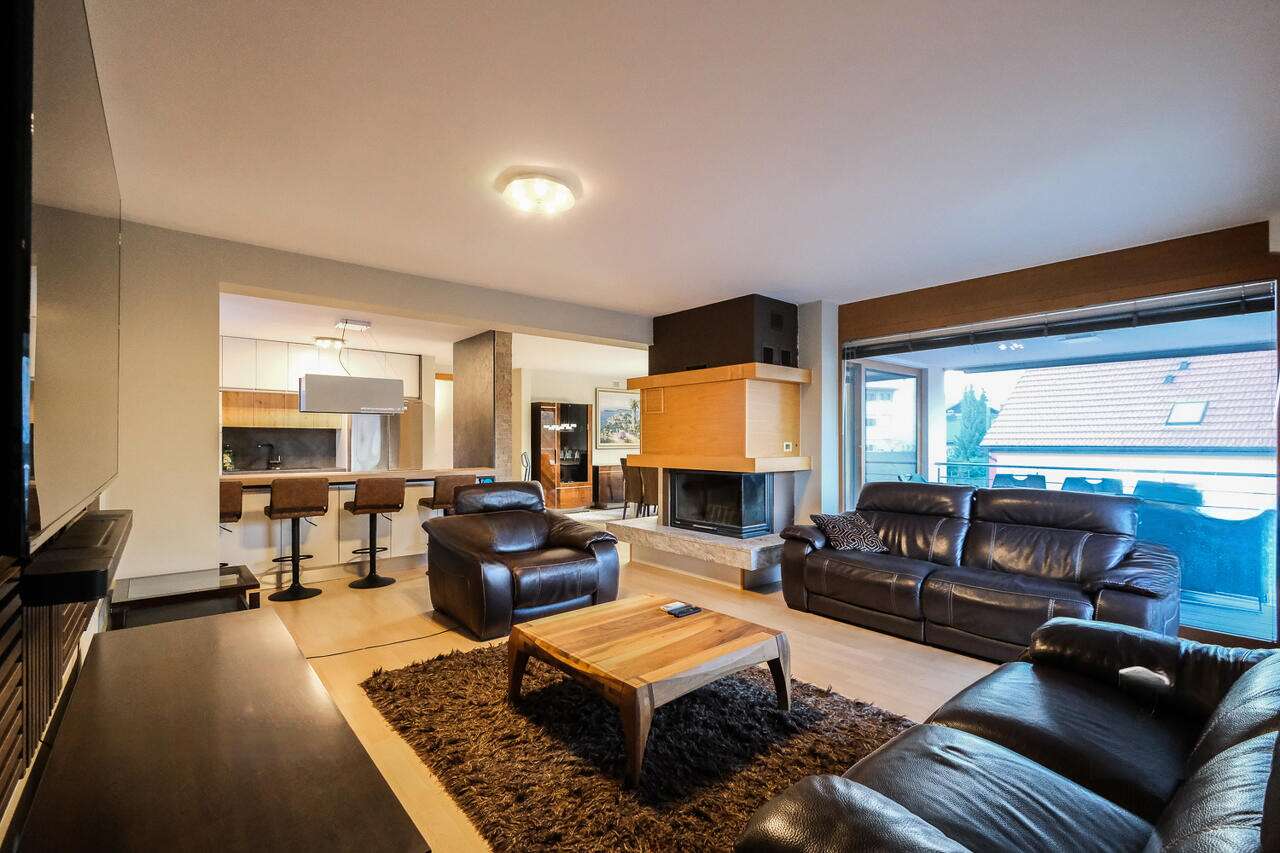 На участке имеется аккуратный огороженный сад с системой автоматического полива и роботом для стрижки травы, а также уютная летняя кухня. Перед зданием расположено крытое парковочное место на четыре автомобиля.