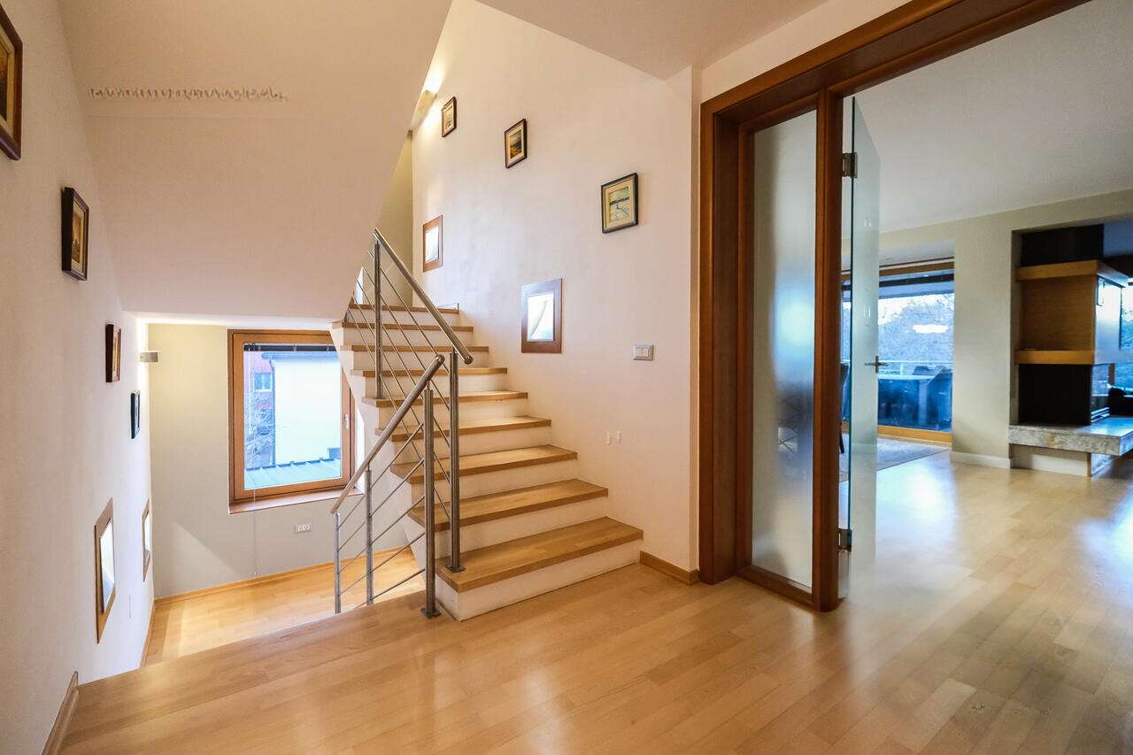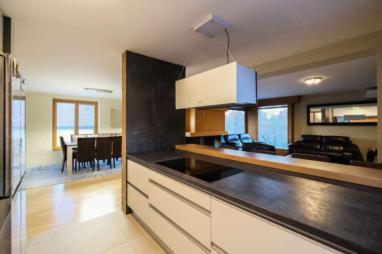 Дом оборудован тепловым насосом и системой теплого пола, имеется оптический интернет. Располагаясь в жилом районе с коттеджами, он прекрасно соединен с кольцевой дорогой. Удобное местоположение и доступность инфраструктуры – школы, детские сады, международное учебное заведение, университетские факультеты и магазины – делают это жилье максимально комфортным для жизни, сочетая все преимущества городской жизни с легким доступом к природе для активного отдыха.