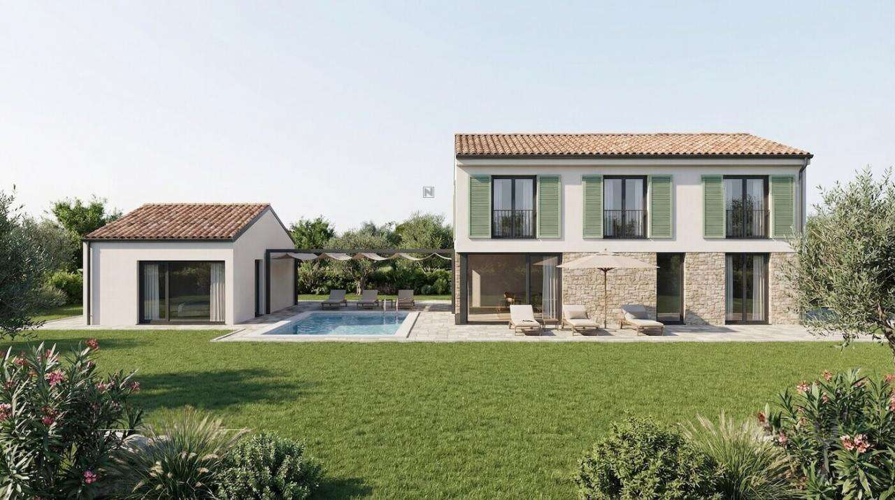 Дом, который представлен для покупки (163,09 м²), находится в спокойной локации, откуда открываются потрясающие виды на хорватскую Истру и линию моря. Просторная терраса позволяет насладиться солнцем и свежим воздухом. На первом этаже расположены большая кухня, столовая, уютная гостиная, кладовая и санузел с прачечной. Второй этаж включает четыре спальни и две ванные комнаты.