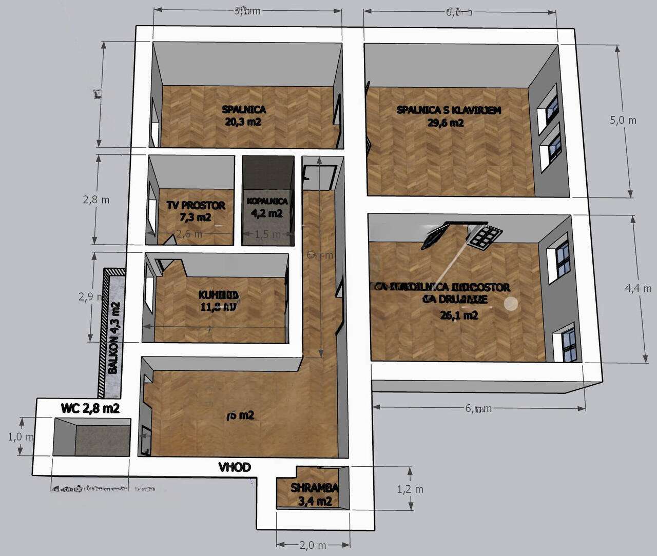 Квартира включает кладовку и просторное чердачное помещение, увеличивая её функциональные возможности. Планировка позволяет трансформацию в четырёхкомнатную квартиру. Высота потолков составляет 3,1 м. Общая площадь включает жилое пространство (125,7 м²), кладовку (3,0 м²), балкон (4,1 м²), подвал (8,1 м²) и чердачное помещение (16,9 м²).