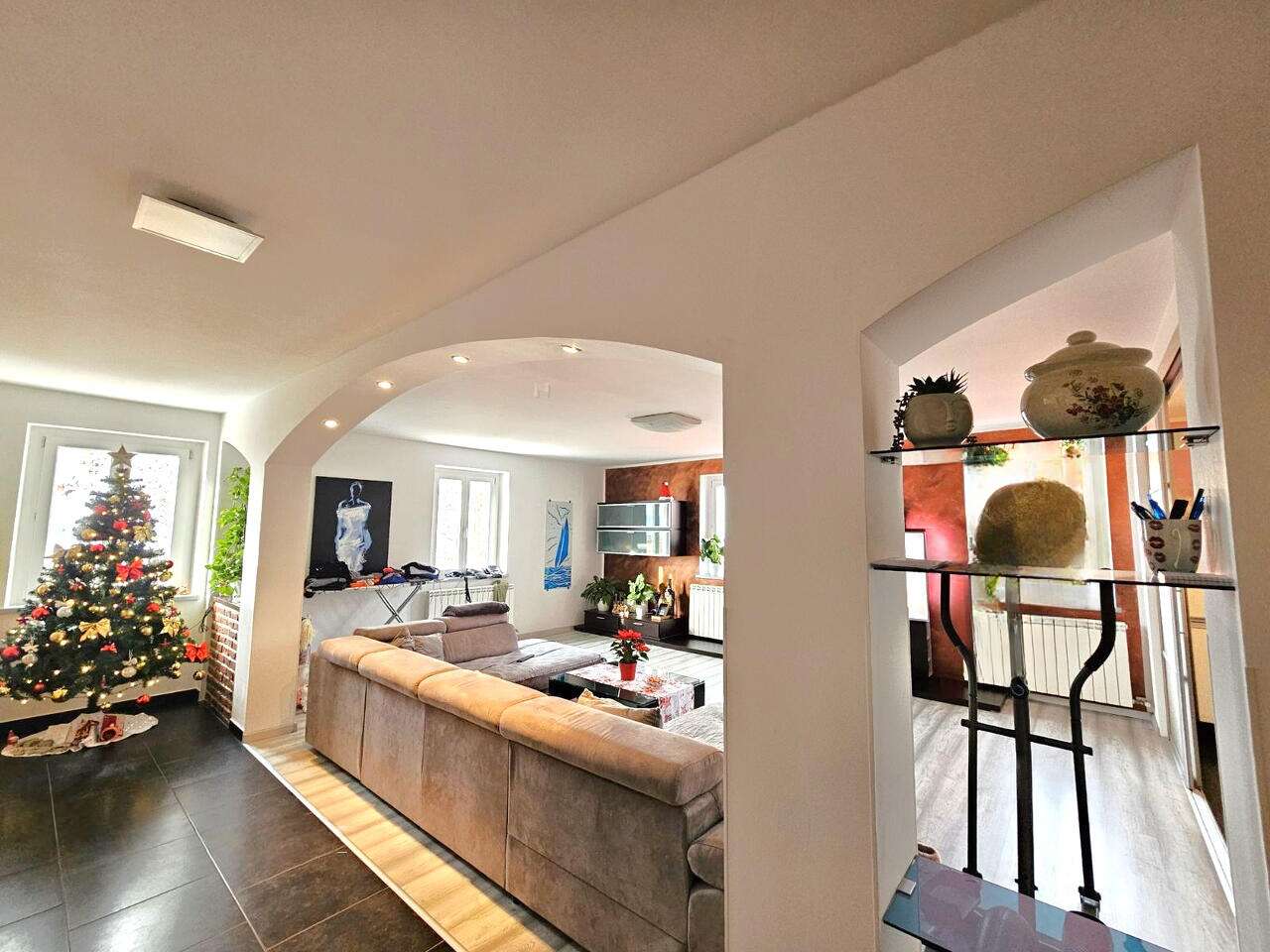 На трех уровнях, четырёхкомнатная дуплекс-квартира в Хрватини, площадью 179,7 м², очаровывает открытым пространством и светлыми комнатами. Возведенная в 1920 году и обновленная в 2020, она предлагает роскошную террасу размером 21 м², откуда открывается великолепный вид на морское побережье и зеленые окрестности. Жилье расположено на втором этаже двухэтажного дома с мансардным этажом.