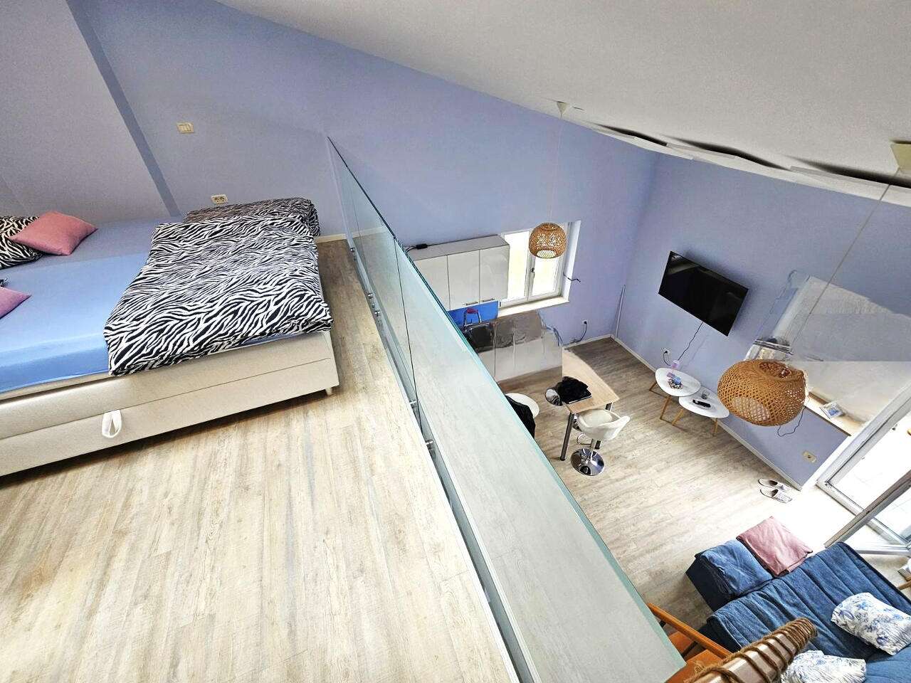 Квартира привлекает функциональным дизайном: просторное преддверие позволяет войти в стильный интерьер, где находятся ванная, а также объединенное жилое пространство, включающее гостиную и кухню, с доступом к террасе. Внутренняя лестница ведет на галерею, обустроенную под спальню. Жильцы также могут воспользоваться дополнительной кладовой, а в доме организована общая велопарковка. Квартира предлагается полностью меблированной и оборудованной современной системой кондиционирования, подключением к оптоволоконной сети. Парковка доступна возле здания.