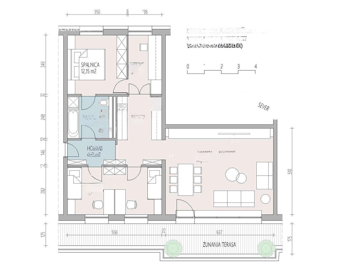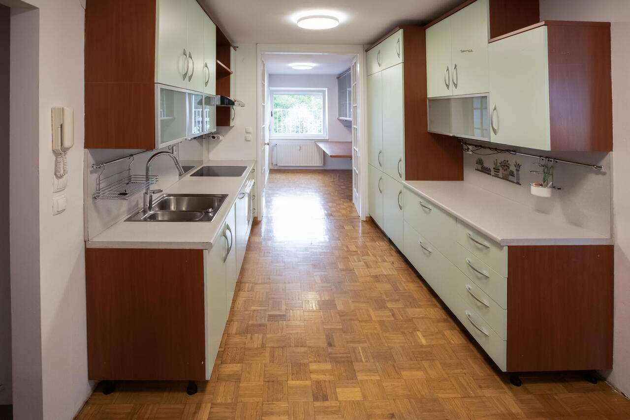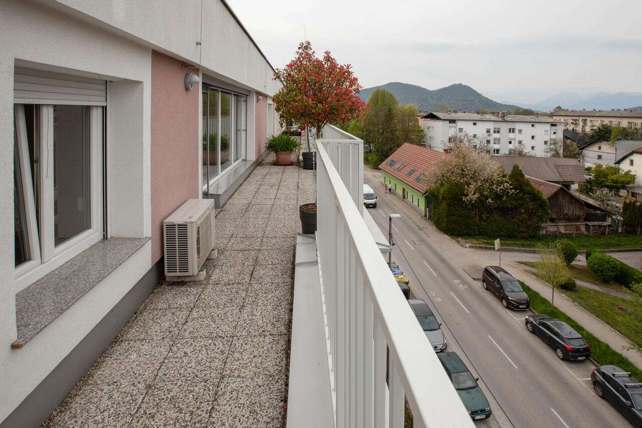 Светлая и просторная квартира общей площадью 90 м² занимает последний, четвёртый этаж многоквартирного дома, который расположен в районе Шентвид, на окраине Любляны. Из окон открывается захватывающий вид на природные красоты — Шмарнскую Гору, Рашицу и Камнишские Альпы. Внутренняя планировка включает кухню, совмещённую зону гостиной и столовой, две спальни, кабинет, прихожую и ванную комнату. Стеклянная стена между гостиной и столовой ведет на террасу, даря панораму на протяжении всего дня.