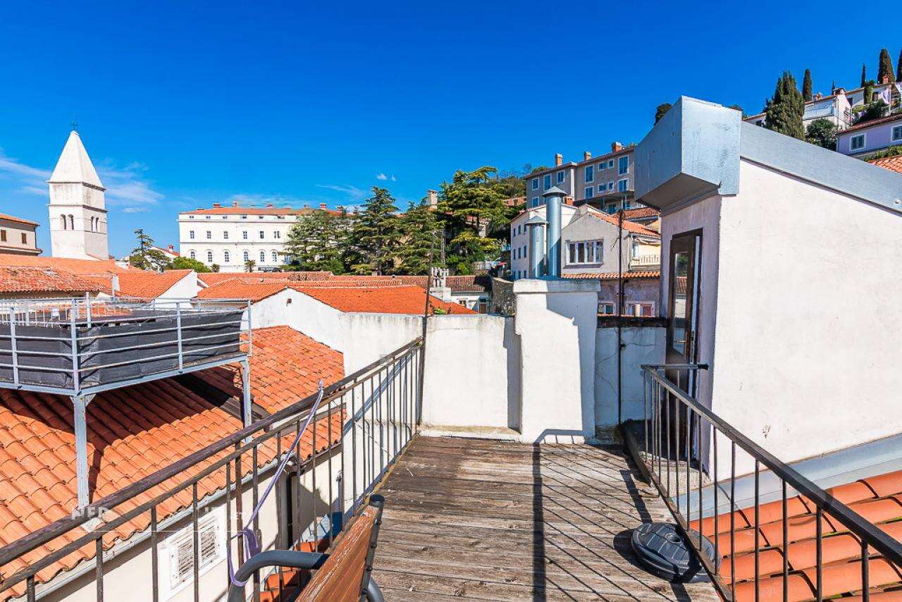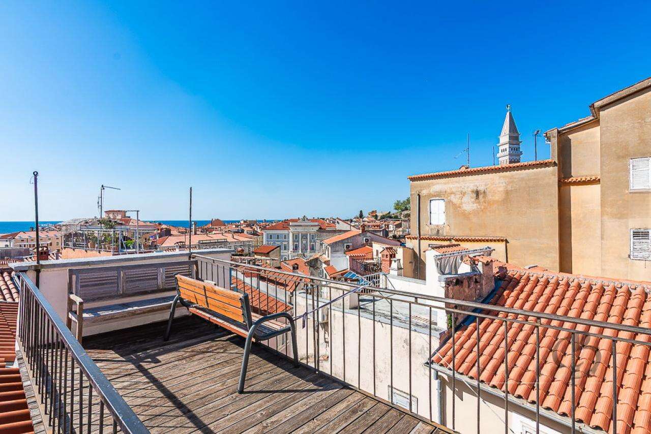 Квартира гармонично сочетает атмосферу исторического центра с современными удобствами. Шаговая доступность к Площади Тартини – неоспоримое преимущество. Особое очарование придаёт крытая терраса размером 10,6 м², с которой открывается средиземноморская панорама на крыши Пирана, извилистые улочки и морской горизонт.