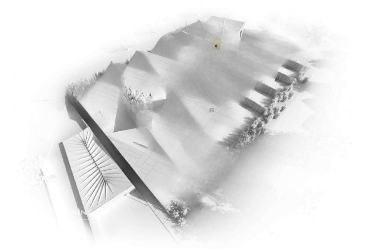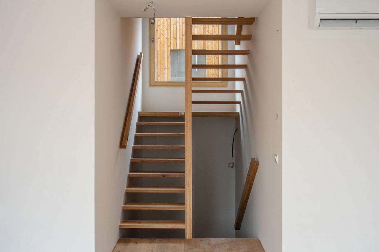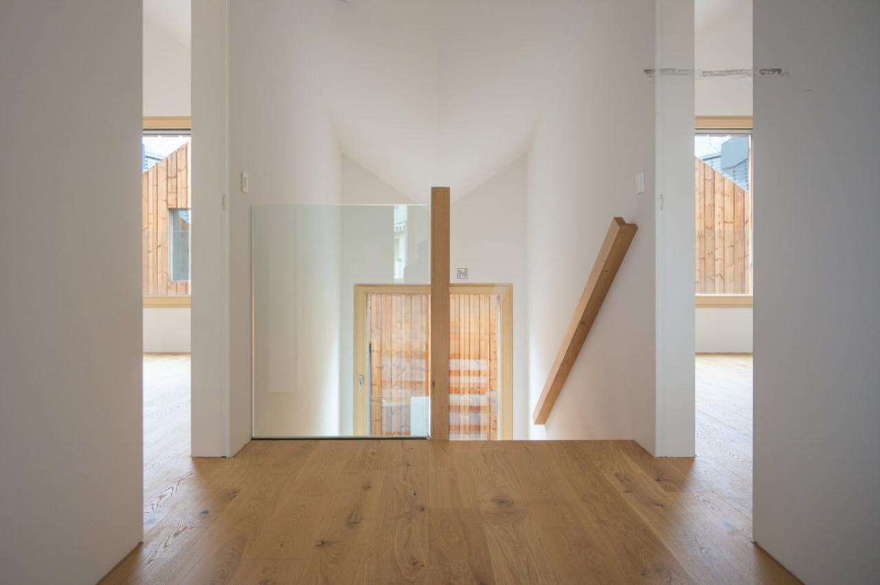 Внутренний интерьер включает в себя просторную гостиную с камином площадью 34,18 м², уютную кухонную зону размером 10,91 м², две небольшие спальни и дополнительную гостевую ванную комнату. Просторный атриум площадью 31,81 м² служит личной открытой зоной для отдыха. Дом занимает участок земли размером 30,1 м² и состоит из подвала, первого этажа и мансарды.